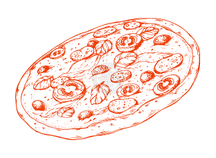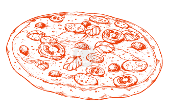 Pomidorų padažas, sūris* faršas, pievagrybiai, česnakas, raud. Svogūnai, juodos alyvuogės, jalapenai